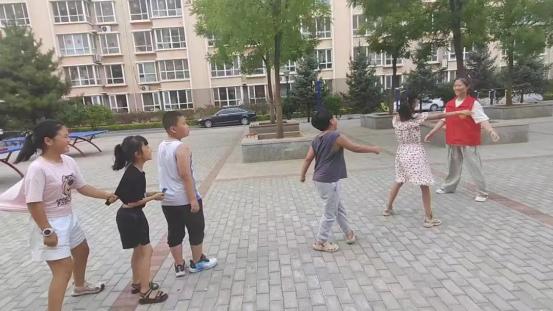 活動(dòng)期間,志愿者帶領(lǐng)社區(qū)周邊的孩子開展趣味跑、跳大繩、老鷹抓小雞、石頭剪刀布等游戲,孩子們盡情的玩耍,快樂的笑聲飄蕩在社區(qū)的上空。
