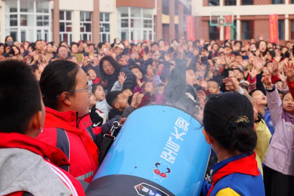 開幕式上,一場精心策劃的大型科學實驗秀成為全場矚目的焦點。在“大象牙膏”實驗里,彩色泡沫如科技之花般瞬間噴涌而出;“空氣火箭”借助氣壓原理一飛沖天,引得師生們陣陣驚嘆;“光影魔術”借助AI視覺技術呈現出動態光影效果,讓孩子們直觀感受到人工智能與光學融合的奇妙。科學教師團隊化身“科技魔法師”,以趣味十足的實驗講解深奧原理,將抽象的科學知識轉化為直觀可感的體驗,瞬間激發了孩子們的好奇心與探索欲望。校長在致辭中指出:“科技是創新的翅膀,童年是夢想的搖籃。本次活動旨在打破學科界限,通過跨學科項目化學習,讓學生在‘做中學、玩中學’,在探索中保持好奇心,在實踐中激發求知欲。”